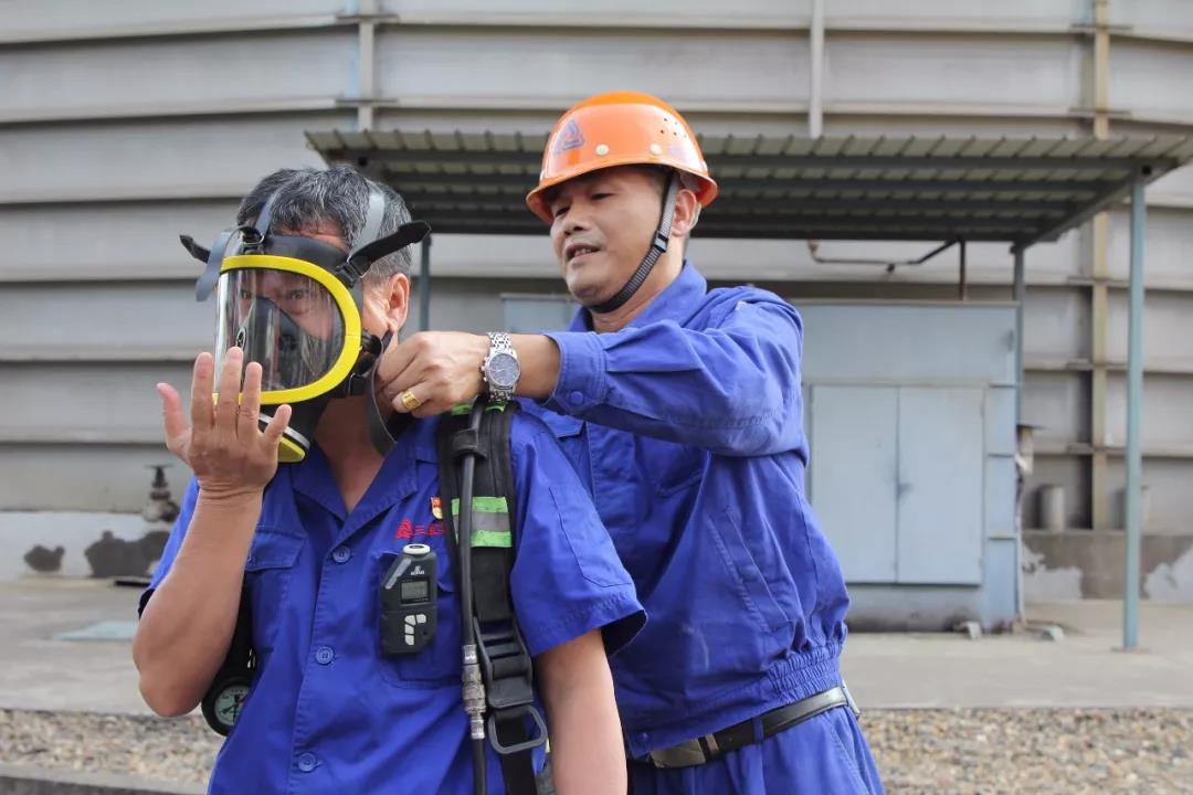 “瓶口向上,打開瓶子,檢查氣壓......戴好面罩,檢查氣密性,綁緊帶子......”這是煤氣車間主任蔡志聰在進(jìn)行“呼吸器使用技巧培訓(xùn)”。