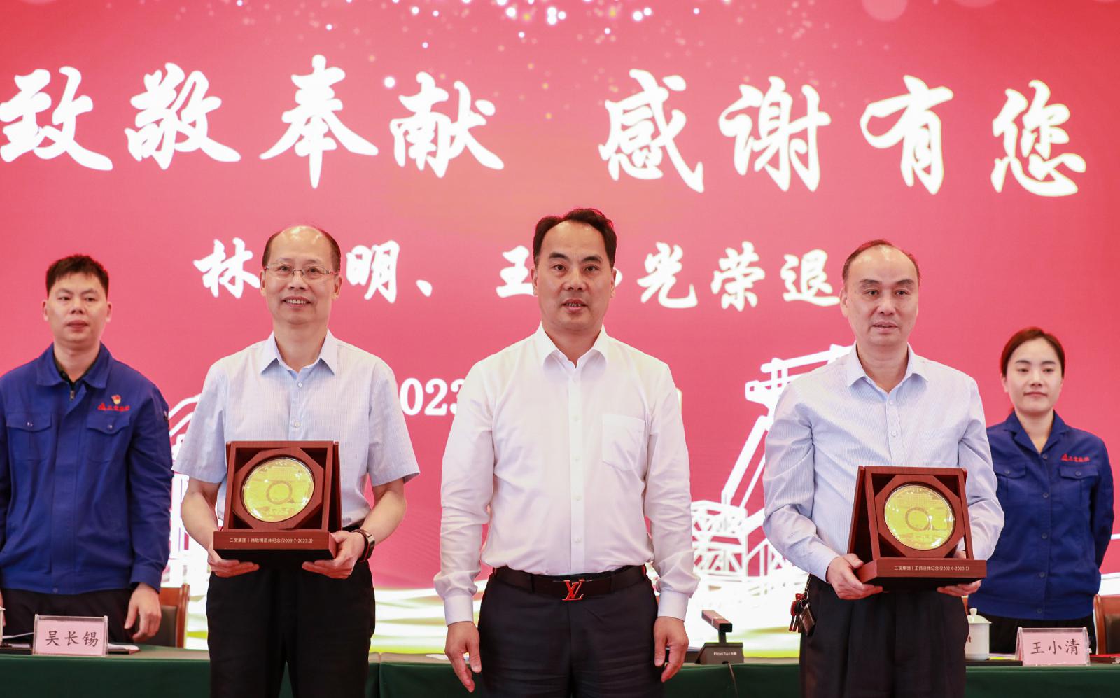 大會舉行老干部光榮退休儀式。王董事長為退休干部林致明、王偉頒發(fā)光榮退休紀(jì)念金牌,并向光榮退休的干部員工致敬,感謝他們?yōu)槿龑氉龀龅呢暙I。