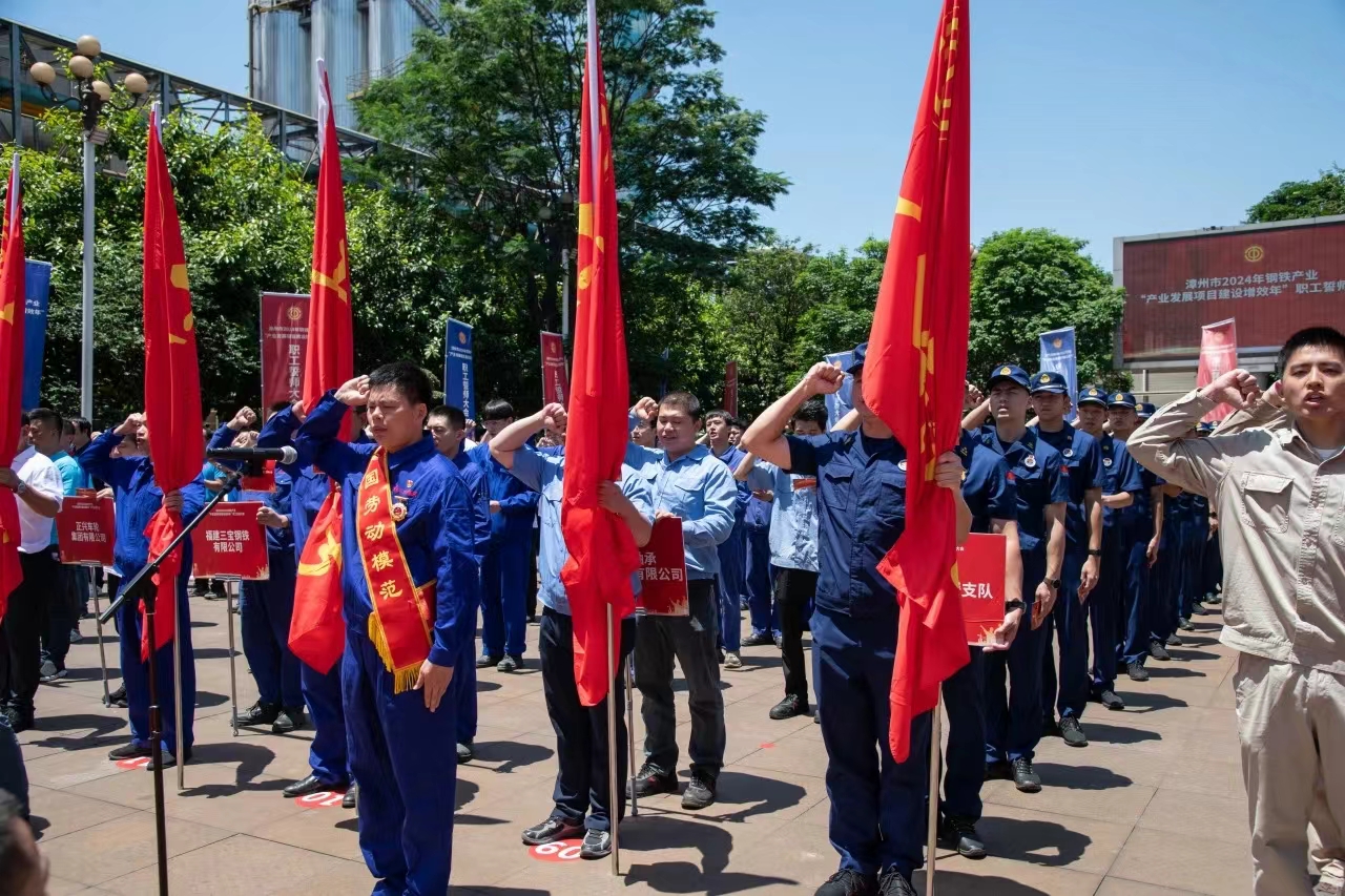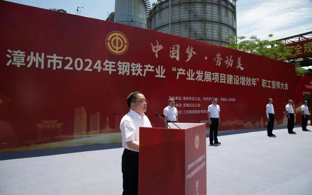 為大力弘揚勞模精神、勞動精神、工匠精神,展現(xiàn)漳州市鋼鐵產業(yè)職工隊伍的時代風采和使命擔當,扎實做好“穩(wěn)運行、防風險、提質量、優(yōu)結構、促轉型、增效益”工作,推進我市鋼鐵工業(yè)高質量發(fā)展,5月29日,由漳州市總工會、中共薌城區(qū)委、薌城區(qū)人民政府聯(lián)合主辦,薌城區(qū)總工會承辦,三寶集團股份有限公司協(xié)辦的漳州市2024年鋼鐵產業(yè)“產業(yè)發(fā)展項目建設增效年”職工誓師大會,在薌城區(qū)浦南鎮(zhèn)三寶集團股份有限公司廣場舉行。市人大常委會主任李東河,市委常委、秘書長、市總工會主席張鴻,市政府副市長林少金出席活動。