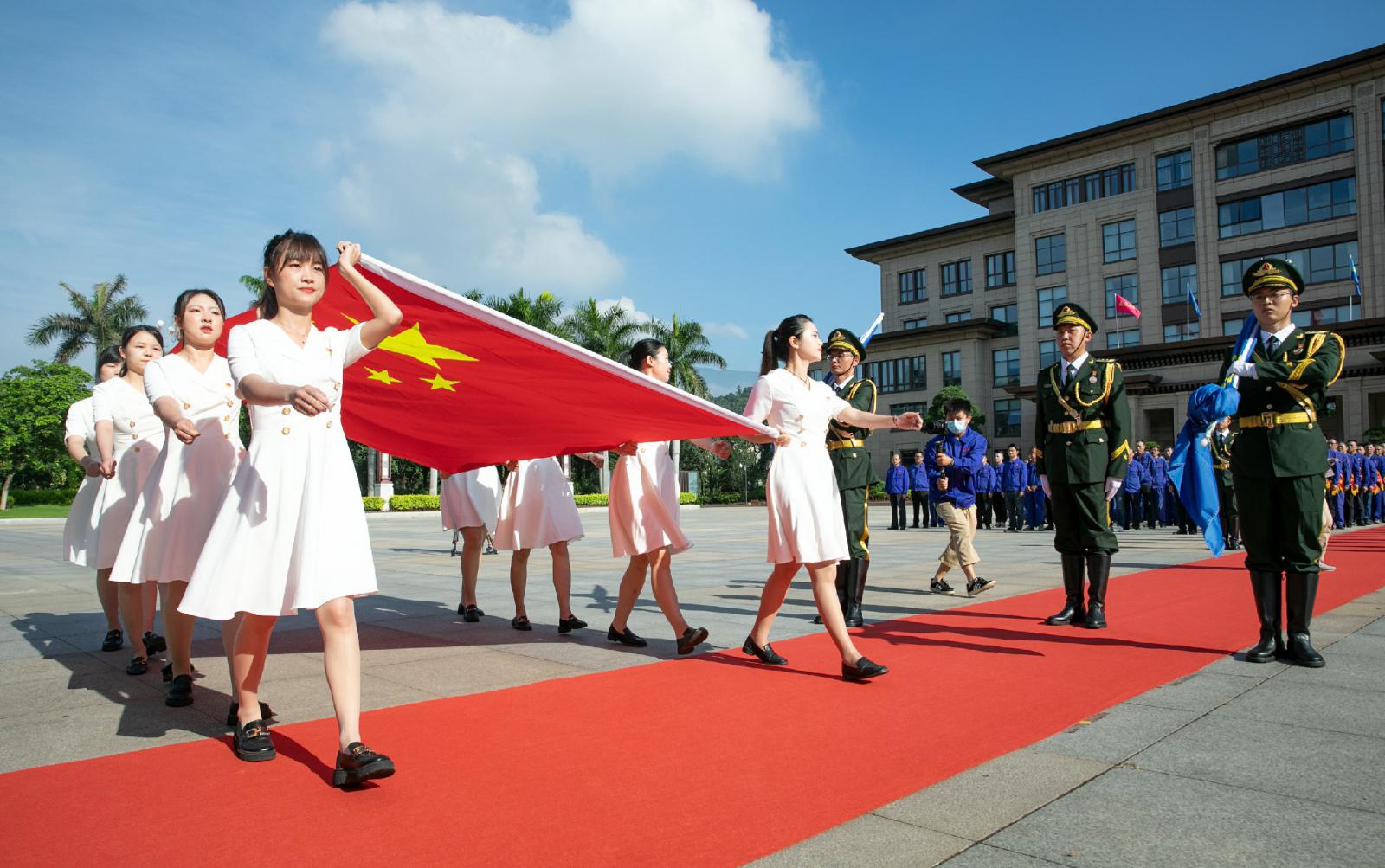 女護(hù)旗手素雅的白裙襯托五星紅旗鮮艷如火,代表著三寶人對(duì)黨純潔的初心,護(hù)旗方陣鏗鏘有力的正步,體現(xiàn)三寶力量與鋼鐵人的擔(dān)當(dāng)。