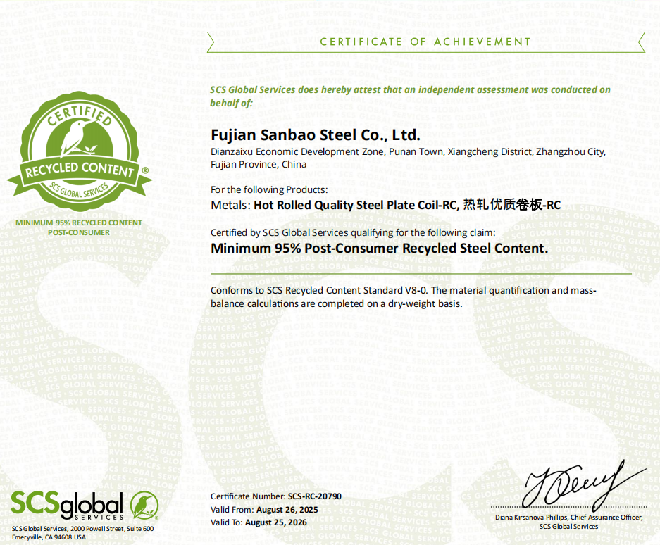 近期,經(jīng)過全球權(quán)威認(rèn)證機(jī)構(gòu)SCS Global Service嚴(yán)格審核,福建三寶鋼鐵有限公司“熱軋優(yōu)質(zhì)卷材(RC級)”順利通過SCS翠鳥認(rèn)證,獲得“翠鳥”證書。